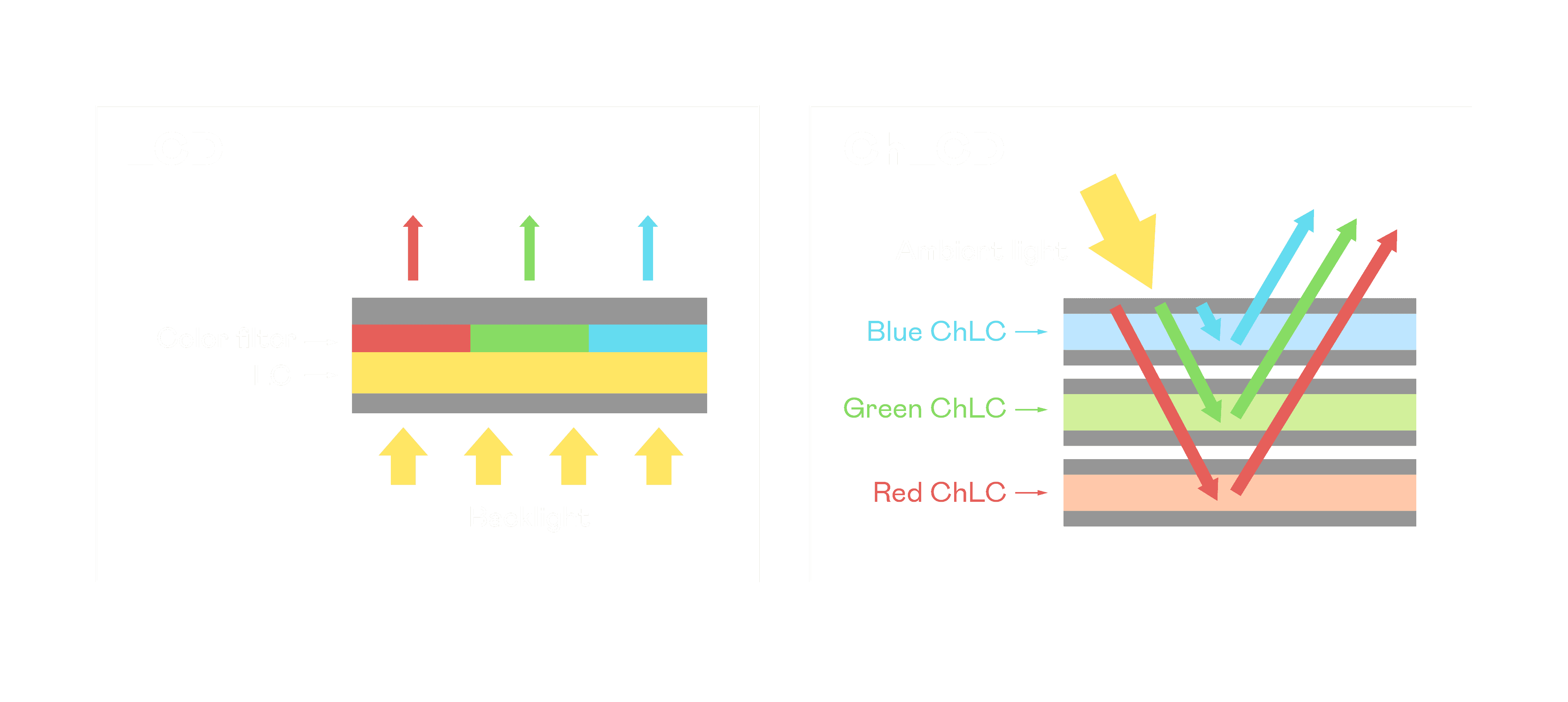 由于超低功耗与媲美平面印刷的色彩表现力,,加上没有 LED 背光,,长时间阅读,,,,眼睛也不易疲累,,所以对电子书阅读器这类产品而言,,胆固醇液晶是电子书阅读器最理想的显示技术选择。。。
